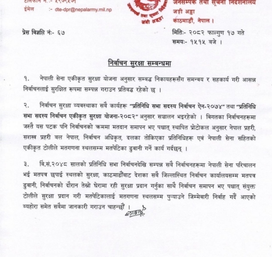 जनसम्पर्क तथा सूचना निर्देशनालयले आइतबार विज्ञप्ति जारी गर्दै नेपाली सेनाले एकीकृत सुरक्षा योजना–२०८२ अनुसार सम्बन्धित निकायहरूसँग समन्वय र सहकार्य गरी निर्वाचन सुरक्षा व्यवस्था मिलाइरहेको जनाएको छ।